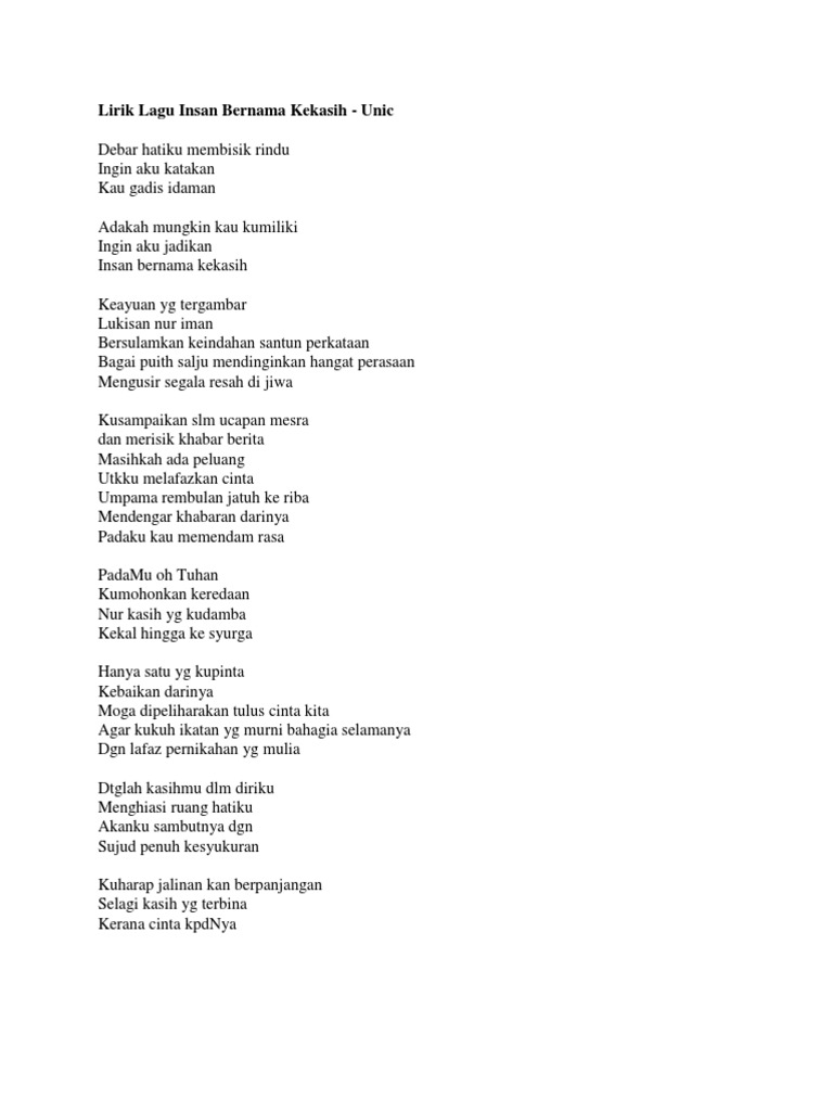 . Nik Ramzi suggested changes to these lyrics. Insan Bernama Kekasih UNIC - Insan Bernama Kekasih Lyrics Debar hatiku membisik rindu Ingin aku katakan Kau gadis idaman Adakah mungkin kau kumiliki Untuk aku jadikan Insan bernama kekasih Keayuan yang tergambar Lukisan nur iman. Kekal hingga ke syurga.